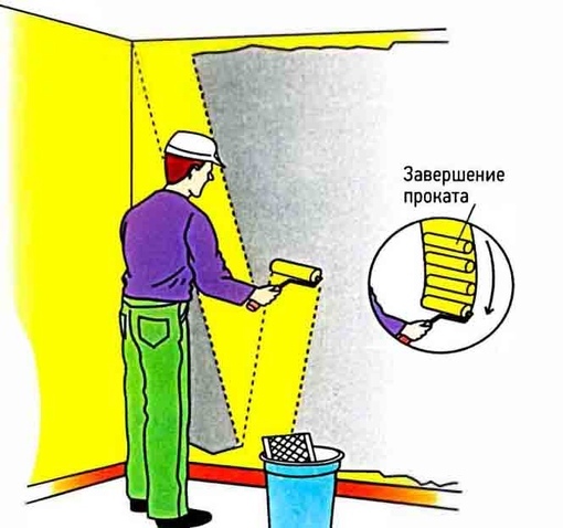 После чего прокатывают валик от потолка к плинтусу, завершая букву М. Работая слева направо, продолжают «рисовать» перехлёстывающиеся буквы М вплоть до правого края окрашиваемого участка. Так же проходят секцию справа налево. Левши могут работать в обратном порядке. После прохода туда и обратно участок будет окрашен.